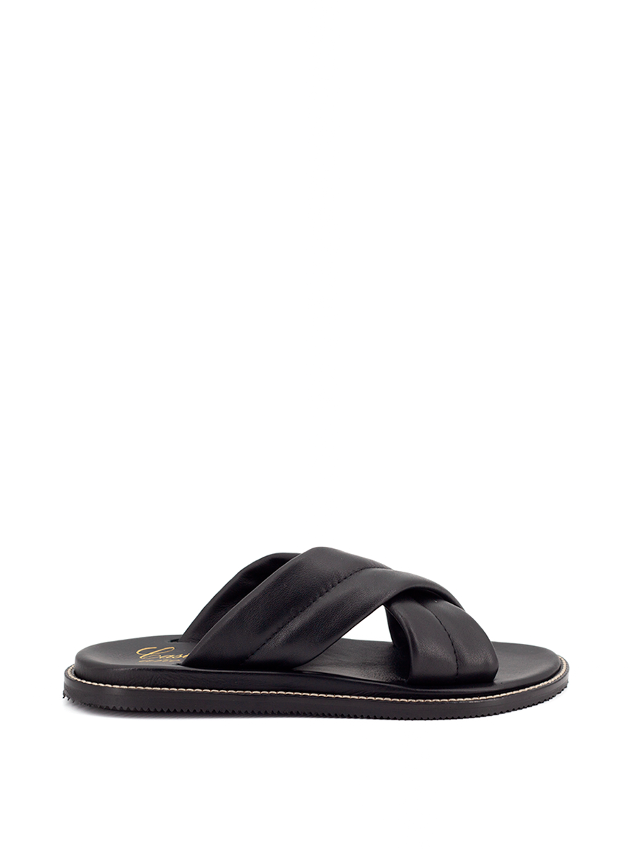 La sandalia Dione en piel negra es el equilibrio perfecto entre sofisticación y comodidad. Su diseño cruzado con tiras anchas acolchadas abraza el pie con suavidad, mientras que la suela flexible garantiza una pisada ligera y segura.